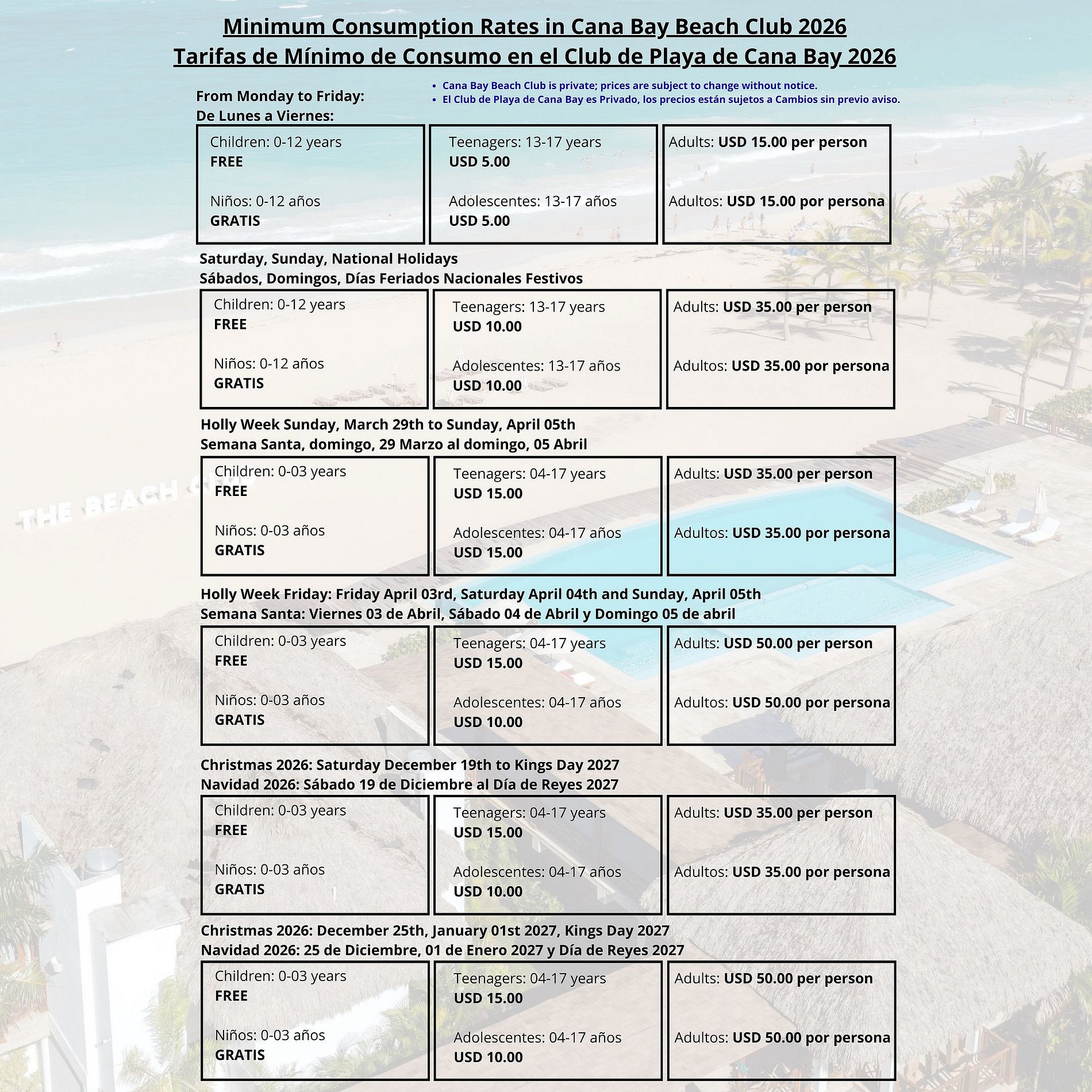 - Cana Pearl is ideally located just steps from the exclusive Cana Bay Beach Club. For a USD 35.00 entrance fee per person (applied as a credit toward your food and beverage consumption), guests can enjoy the stunning beach, a relaxing infinity pool, and a designated swim area for children. Perfect for a luxurious day by the beach—better than a standard hotel day pass! Beach Club hours are 9:00 am to 6:00 pm.